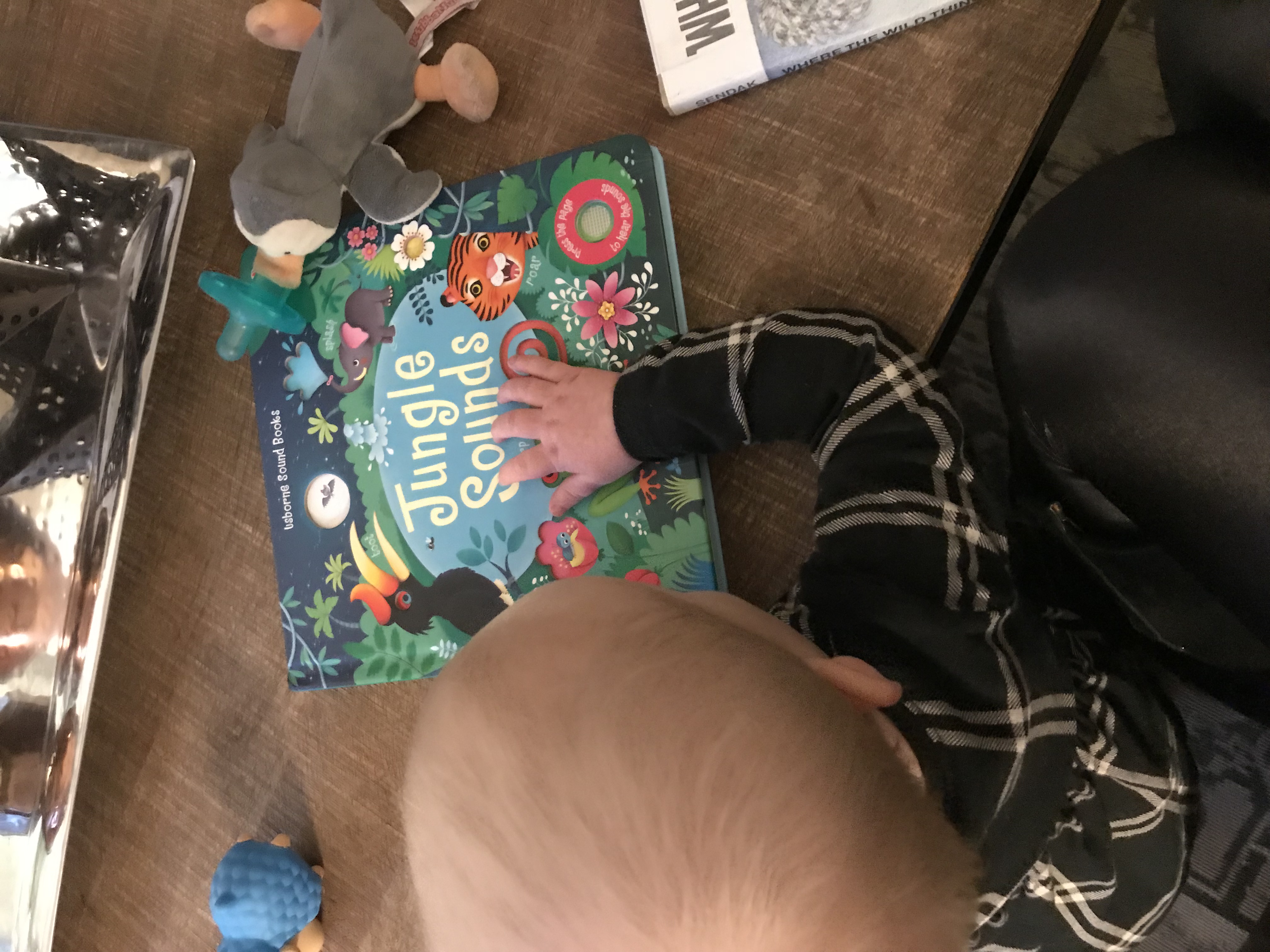 Maggie’s starting to enjoy books more and more, which is amazingly fun. For the most part, she’ll sit still to read (most of) one. She especially loves the ones that make sounds, like this Usborne Jungle Sounds book!: